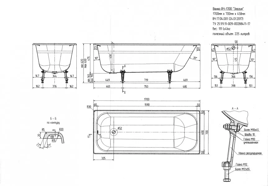 | Высота ванны на ножках, см | 58-61 |
