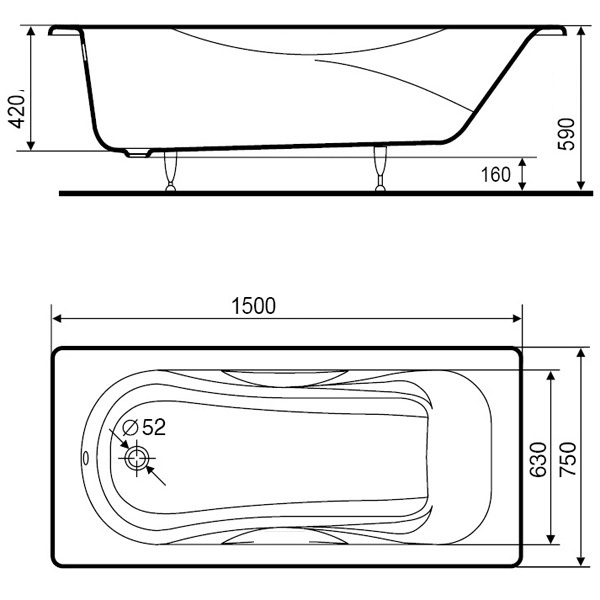 Чугунная ванна Сибирячка 150X75 с отверстиями под ручки, Универсал