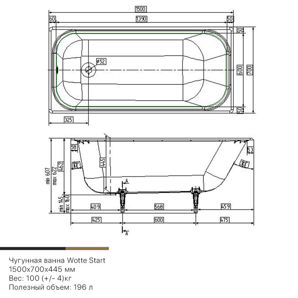 Чугунная ванна Wotte Start 150х70 с отверстиями под ручки