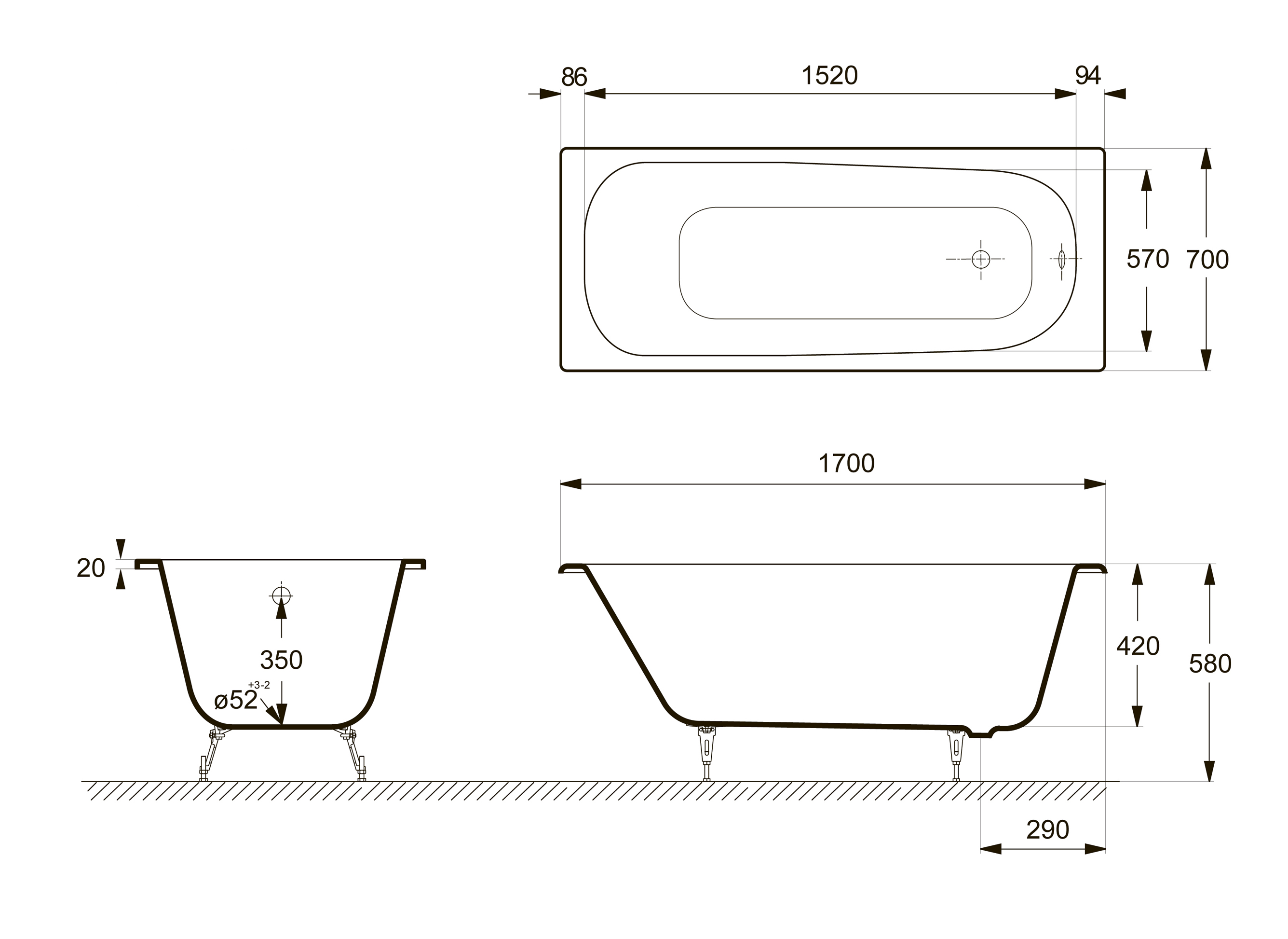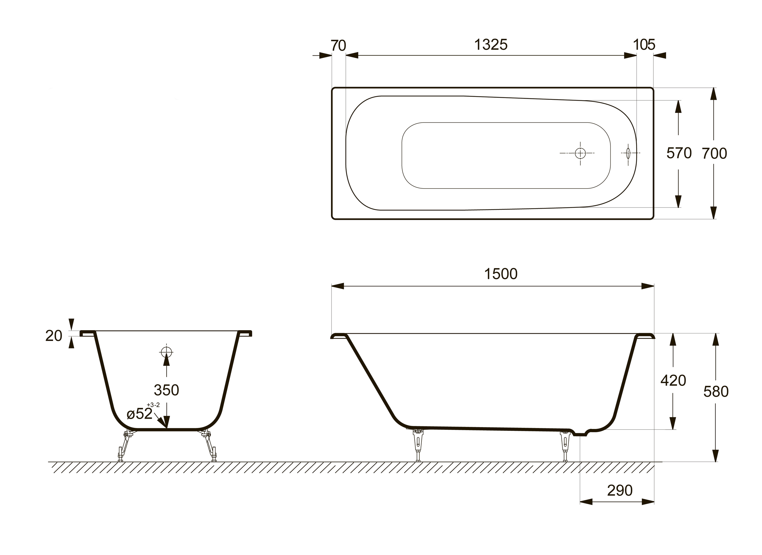 | Высота ванны на ножках, см | 55 - 59.5 |