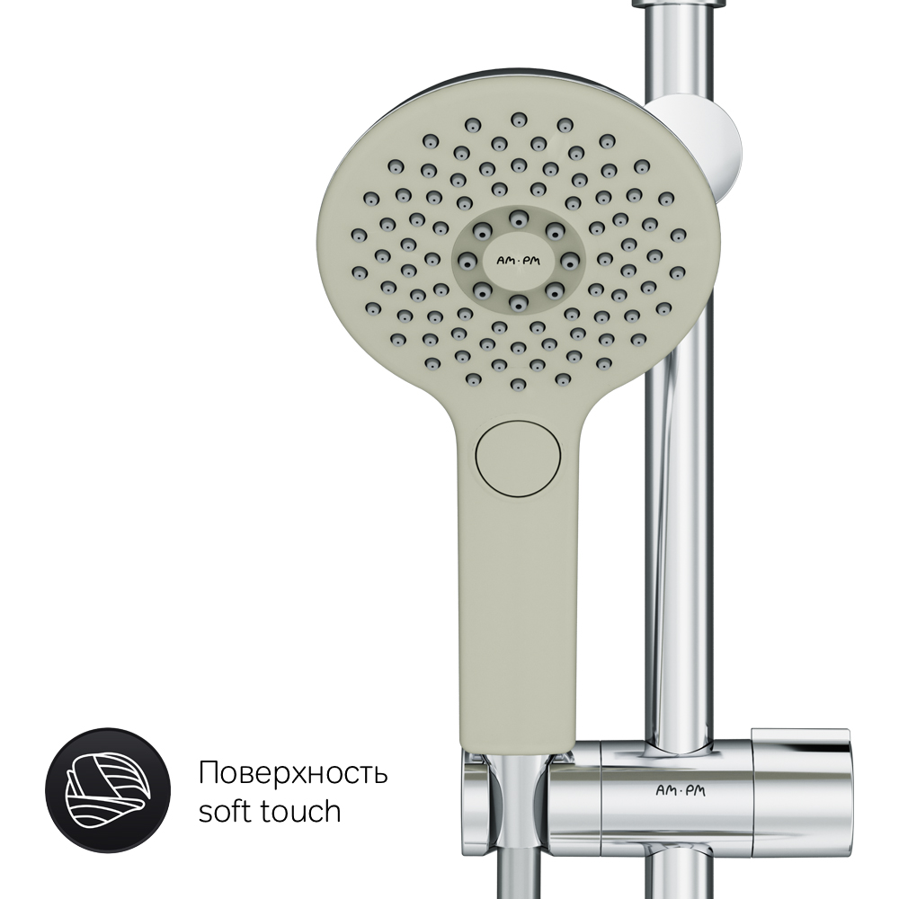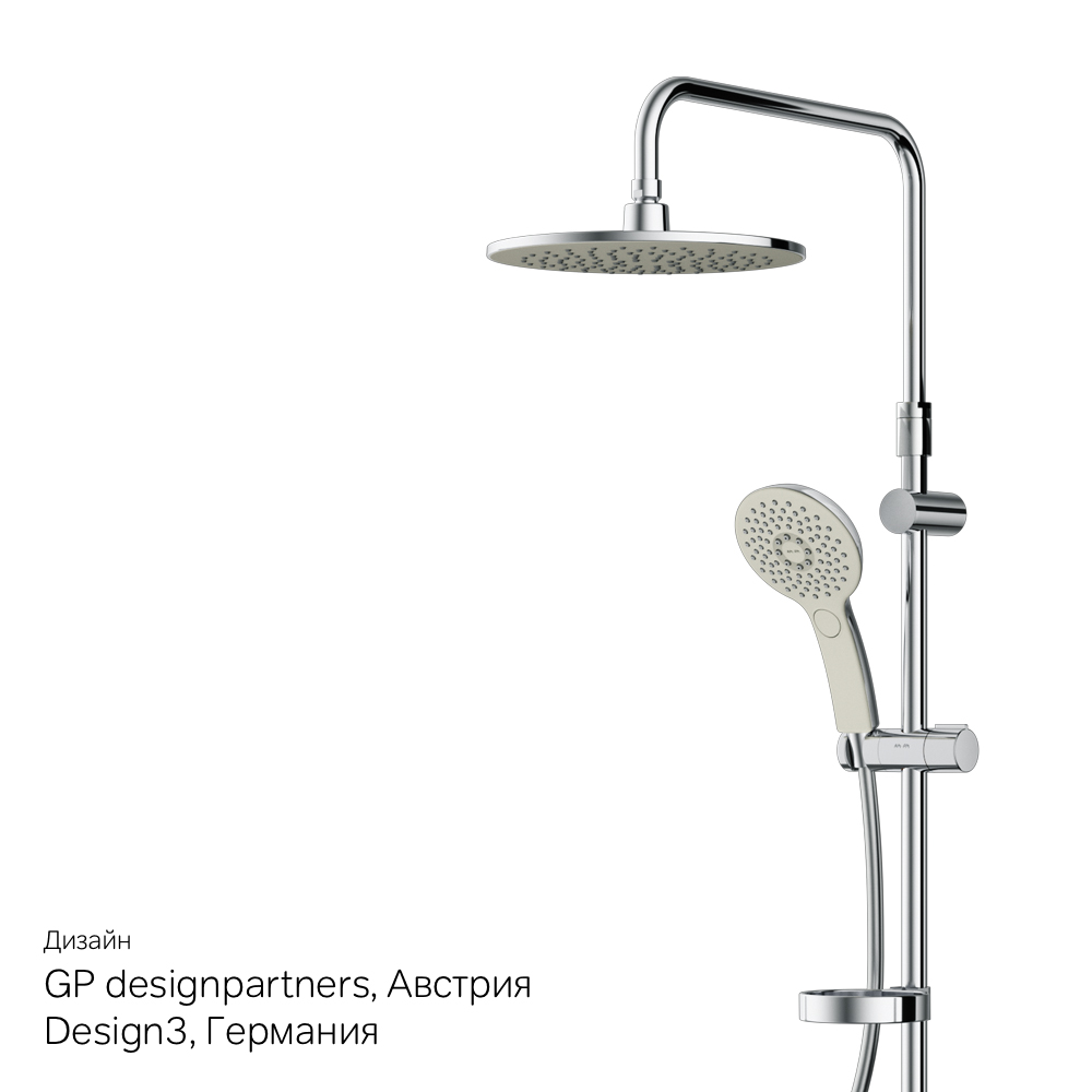 Удивительно тактильный ручной душ за счёт материала поверхности soft touch. Переключающий вентиль с керамическим картриджем  3 режима ручного душа (Spray  EnerJet  Spray + Massage  переключатель режимов Simple Switch Push)  функция Rub&Clean для легкой очистки душевых форсунок  регулируемый в трех плоскостях держатель ручного душа  шаровый шарнир в держателе верхнего душа позволяет регулировать угол наклона  шарнирное соединение защищает душевой шланг от перекручивания. ""