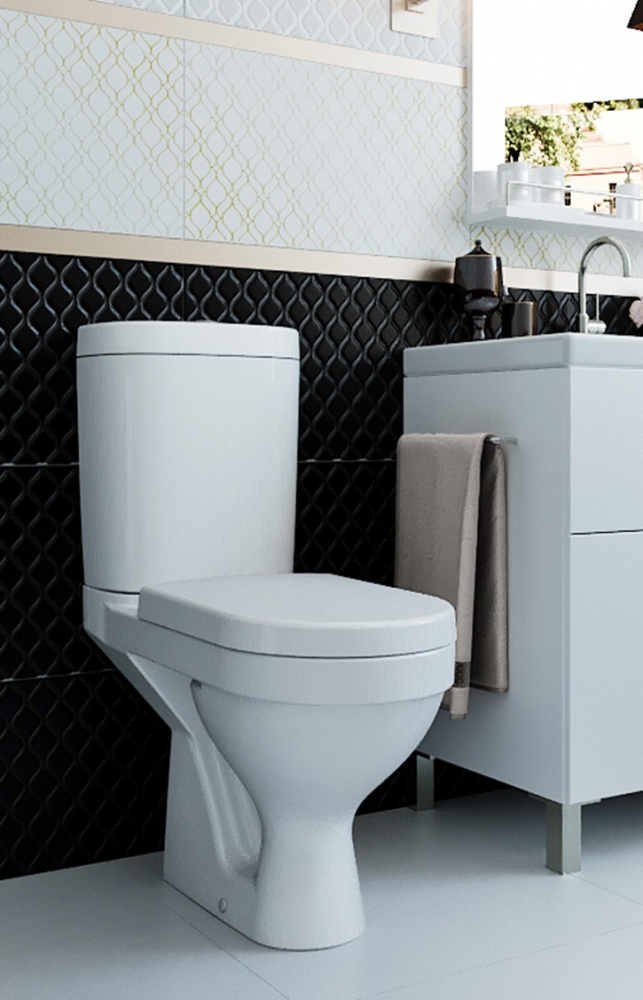 Унитаз керамический, горизонтальный выпуск; бачок смывной керамический с нижним подводом воды; двухуровневый спускной механизм; сиденье для Унитаза из дюропласта с легкосъемом и с функцией плавного закрывания; монтажный комплект; инструкция/гарантийный талон