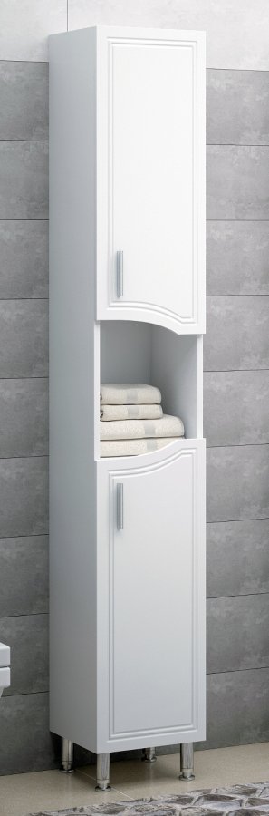 Шкаф-пенал Corozo Креста 55 белый – это строгая и лаконичная прямоугольная модель, выделяющаяся фигурным решением фасадной части, дополнительно акцентированной контурной фрезеровкой. Установленный на четыре металлические ножки, корпус представляет собой некий напольный стеллаж, укомплектованный двумя распашными дверцами со встроенными доводчиками. Изделие произведено из влагостойких материалов высокого качества и покрыто глянцевой пленкой.