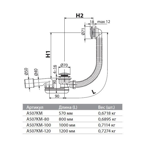 Слив-перелив для ванны AlcaPlast A507KM Click-Clack - ля слива воды из ванны в канализационный сток, для ванн стандартных размеров, с выпускным отверстием ?52 мм.