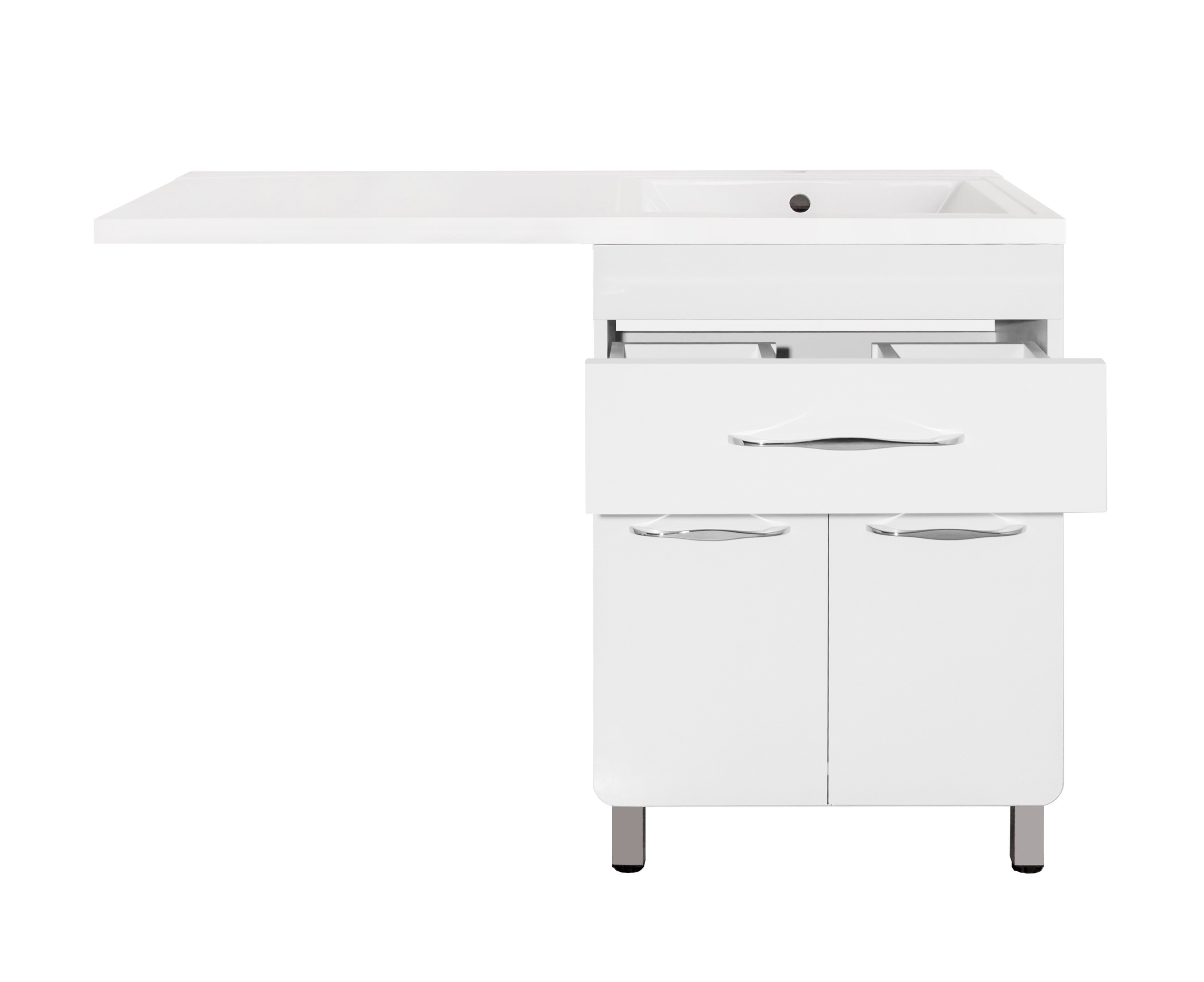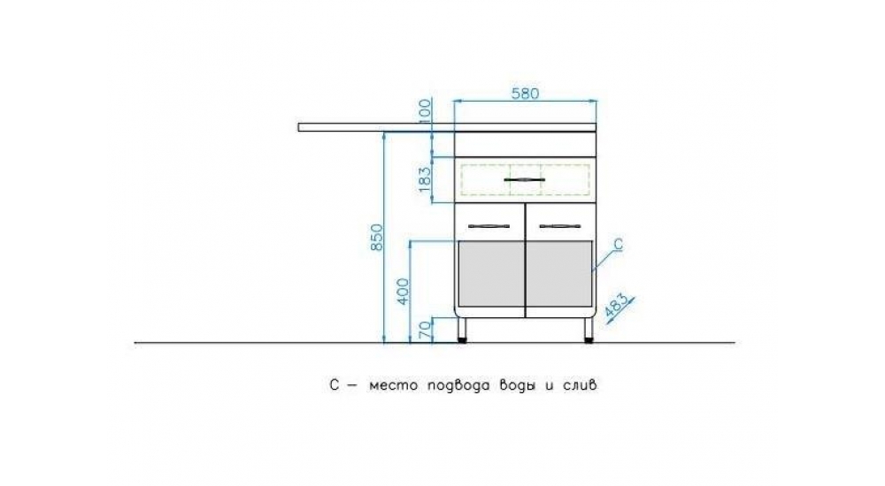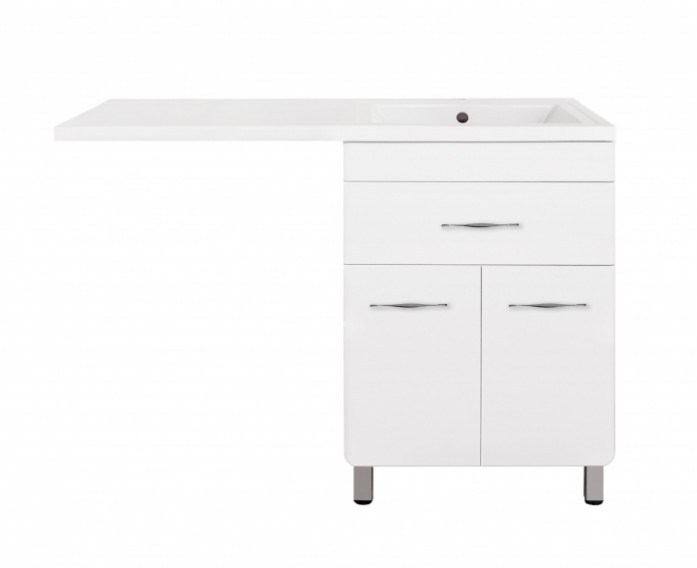 Верхнее выдвижное отделение оборудовано направляющими, установленными по технологии скрытого монтажа. Доводчик плавного закрытия позволяет производить все манипуляции с дверцами тумбы бесшумно и аккуратно. Конструкцией шкафа предусмотрена открытая подводка воды.