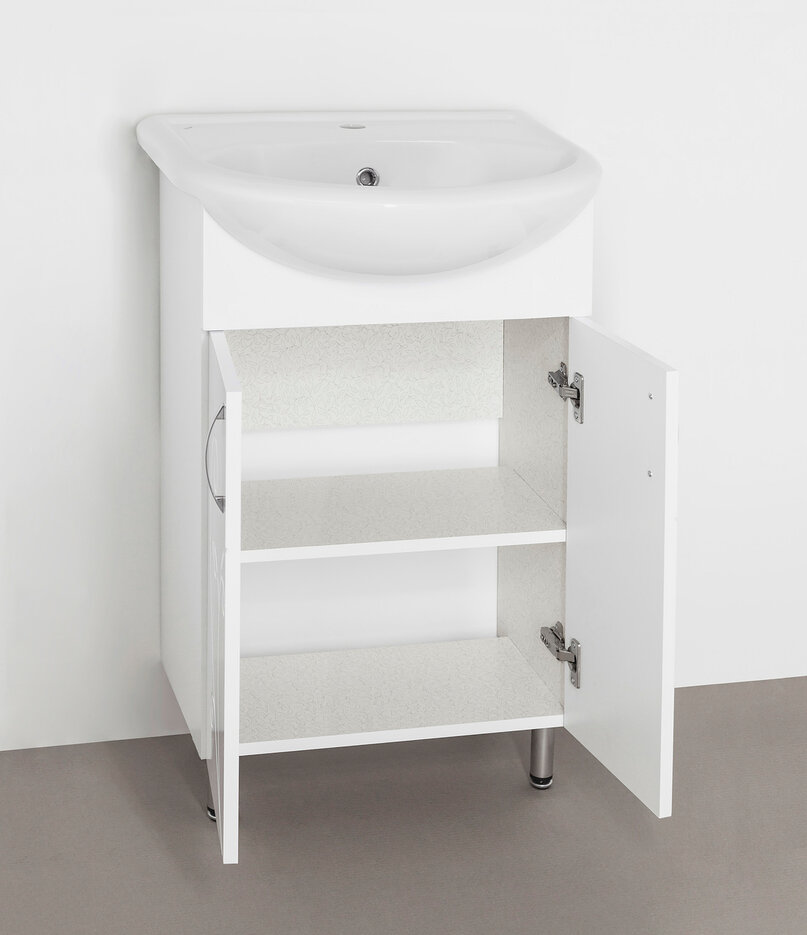 К ее преимуществам относится наличие доводчика закрытия дверок, обеспечивающего плавность хода, уберегающего механизм от повышенного износа и не допускающего возникновения не нужных шумов. Высокие ножки позволяют подойти к тумбе вплотную и пользоваться раковиной без ощущений дискомфорта.