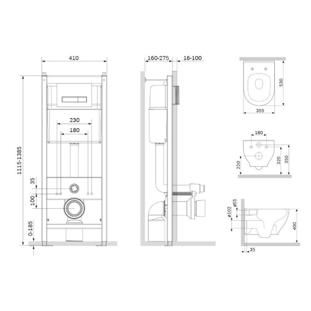 Полностью готовый к установке комплект: система инсталляции с клавишей подвесной унитаз с сиденьем. Неразборная рама из стального профиля выдерживает нагрузку до 400 кг. Полностью изолированный бачок с двухрежимной смывной арматурой. Укомплектован механической клавишей в цвете белый. В комплекте все необходимые патрубки и крепления а также прокладка между унитазом и стеной - звукоизоляция.