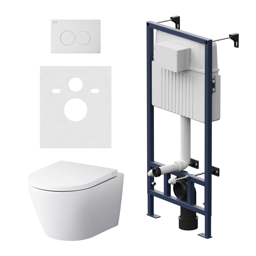 Полностью готовый к установке комплект: система инсталляции с клавишей подвесной унитаз с сиденьем.