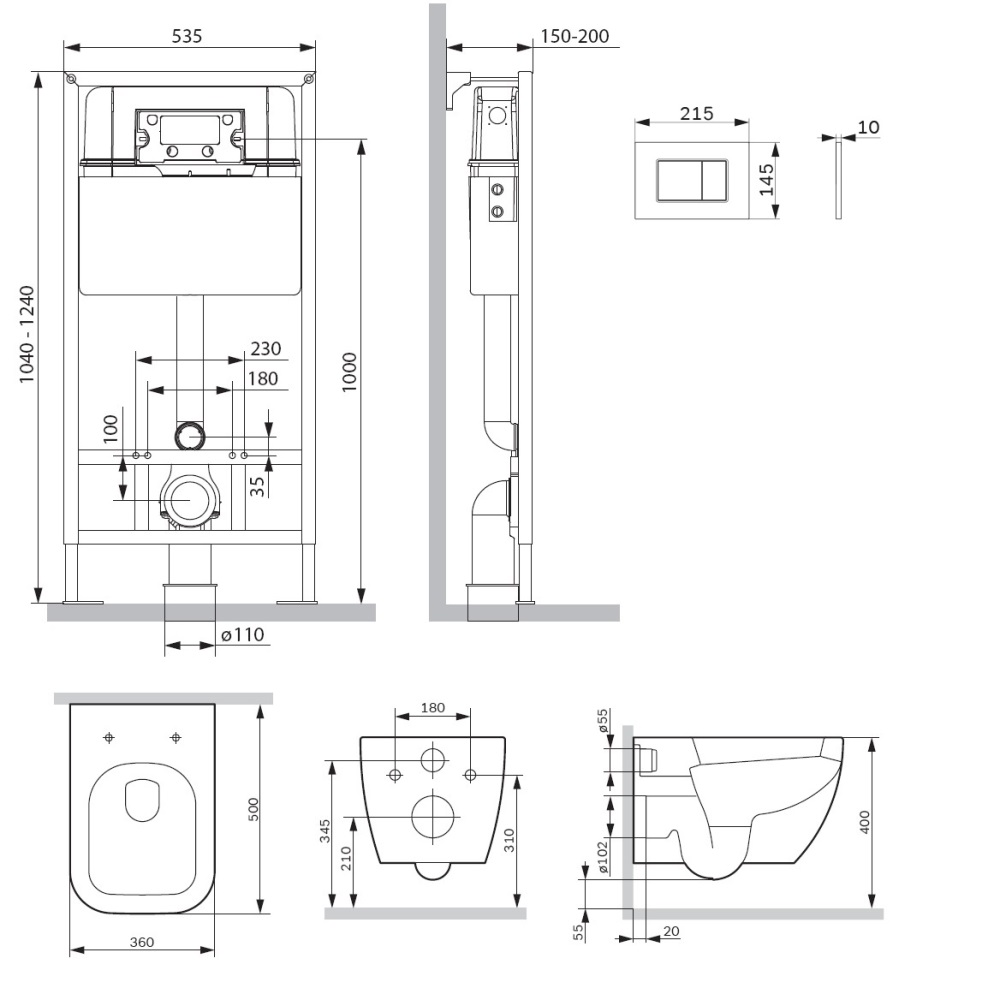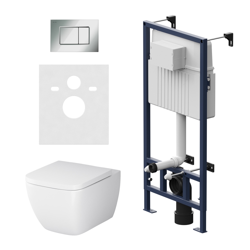 Полностью готовый к установке комплект: система инсталляции с клавишей подвесной унитаз с сиденьем.